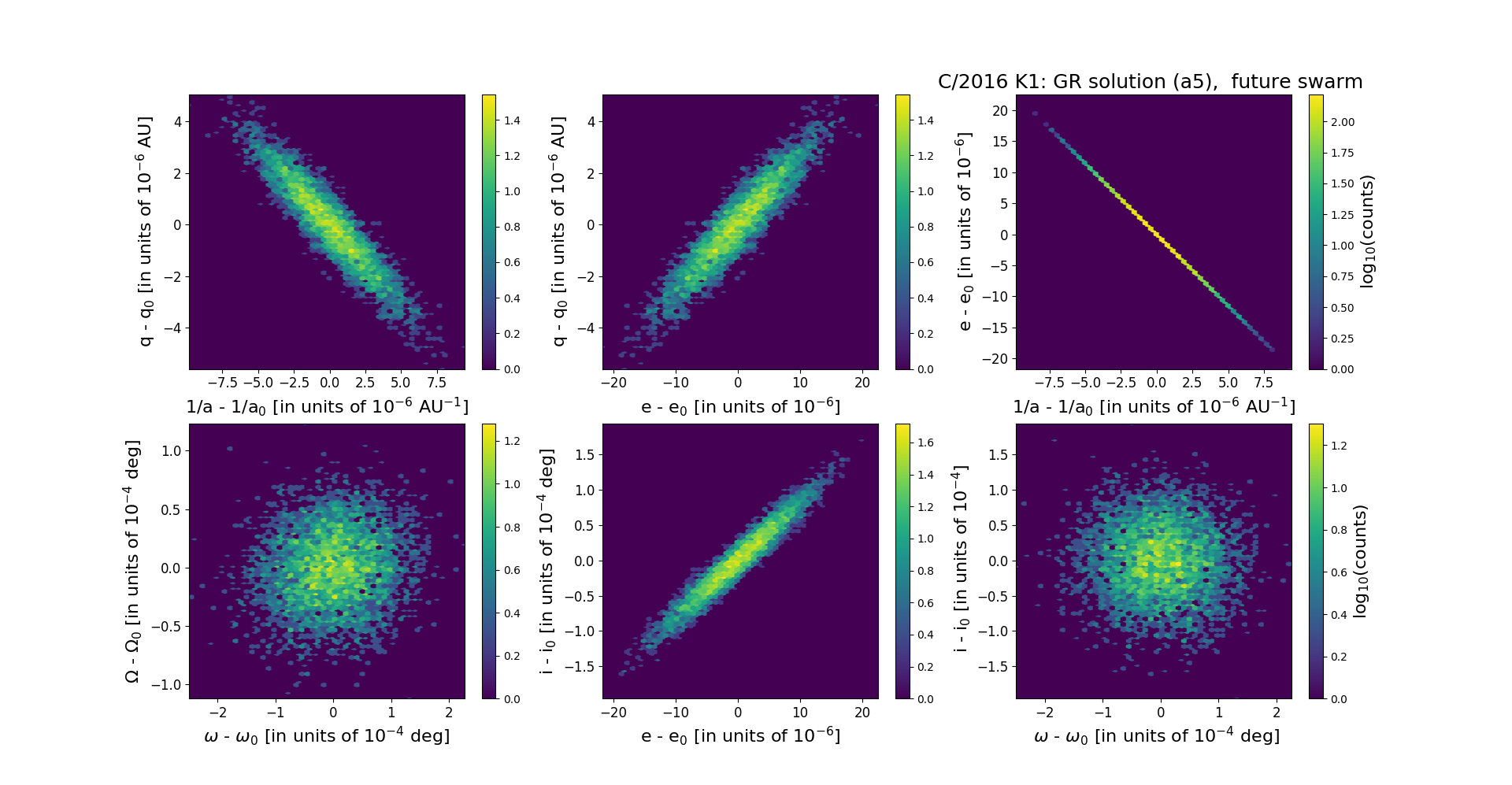 This is a comet with NG effects determinable using positional data fitting. All solutions (GR and NG) are based on data spanning over 0.836 yr in a range of heliocentric distances: 2.34 au – 2.292 au (perihelion) – 3.64 au.