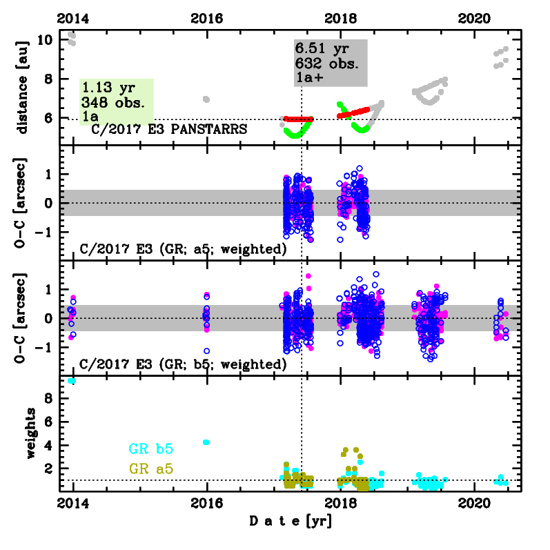 Comet C/2017 E3 was discovered on 7 March 2017 with Pan-STARRS 1 telescope (Haleakala), that is about 3 months before its perihelion passage. Later, it was found on a series of earlier images going back to December 2013. This comet was observed until 20 June 2020.