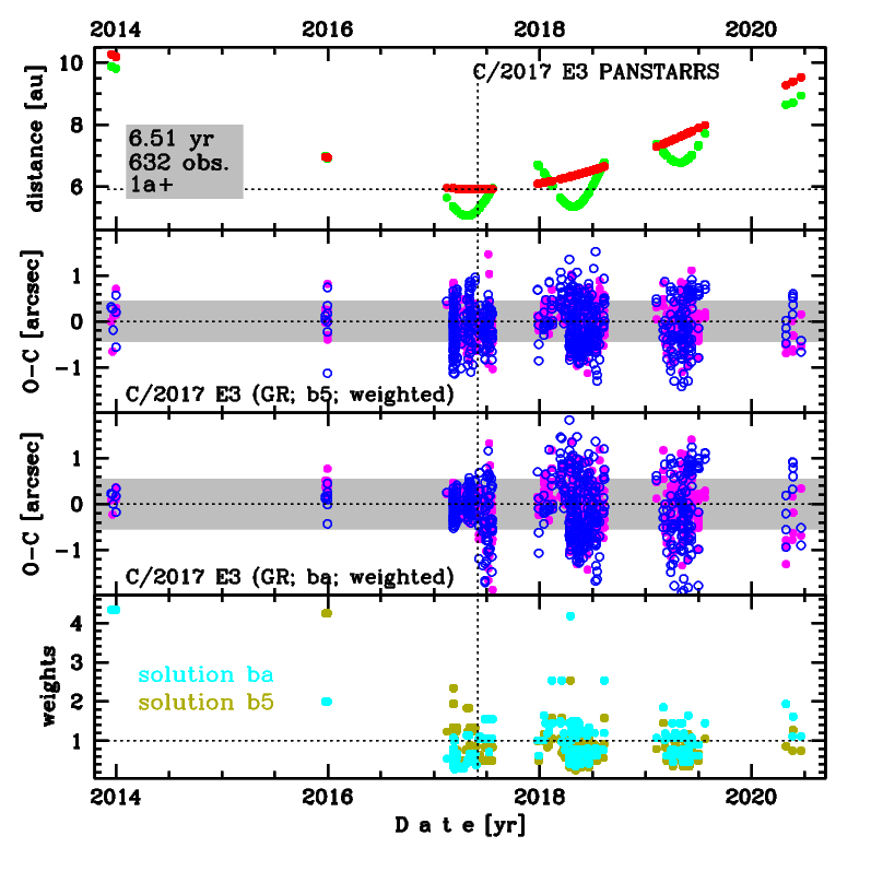 Comet C/2017 E3 was discovered on 7 March 2017 with Pan-STARRS 1 telescope (Haleakala), that is about 3 months before its perihelion passage. Later, it was found on a series of earlier images going back to December 2013. This comet was observed until 20 June 2020.
