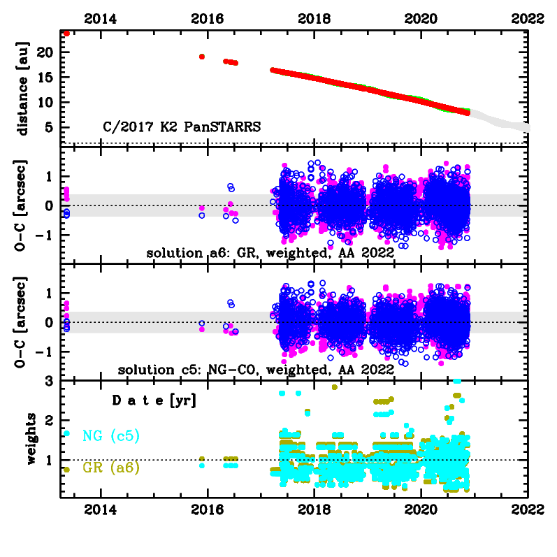 Solutions given here are based on pre-perihelion data and different data-arcs, for more see respective solutions; the longest data arc is spanning over 8.90 yr in a range of heliocentric distances from 23.74 au to 3.52 au (7 April 2022)
