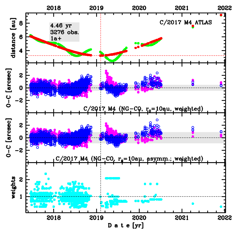 Upper panel: Time distribution of positional observations with corresponding heliocentric (red curve) and geocentric (green curve) distance at which they were taken. The horizontal dotted line shows the perihelion distance for a given comet whereas vertical dotted line — the moment of perihelion passage.