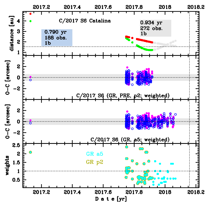 Only GR orbit is possible to obtain. GR solution 'a5' is based on data spanning over 0.934 yr in a range of heliocentric distances from 4.67 au to 1.61 au along pre-peperihelion orbital leg whereas 'p2' is based on shorter data arc spanning over 0.79 yr to a heliocentric distance of 1.95 au.