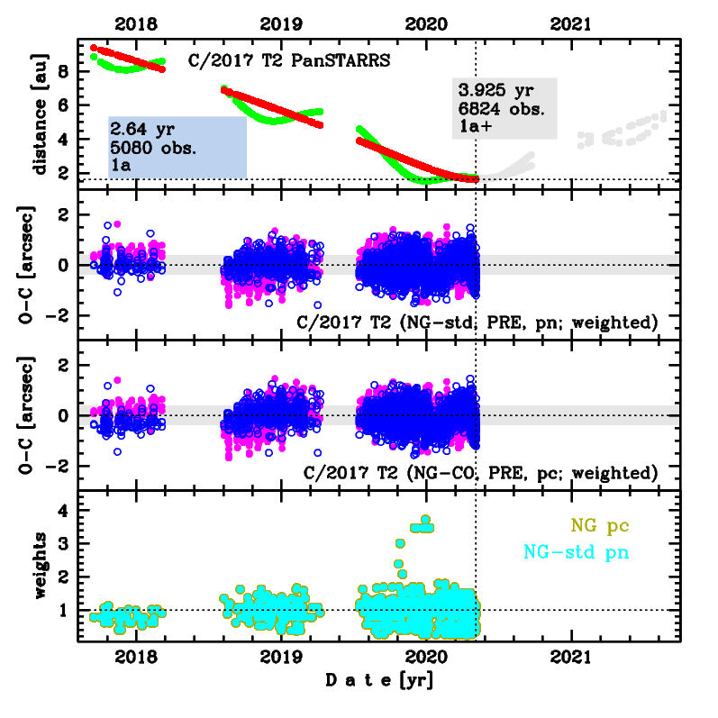 Comet C/2017 T2 was discovered on 2 October 2017 by Pan-STARRS 1 telescope (Haleakala) when it was 9.2 au from the Sun, that is about 7 months before its perihelion passage. Next, pre-discovery data were found going back to September 15. Comet was observed in four oppositions until 19 August 2021. C/2017 T1 had closest approach to the Earth on 28 December 2019 (1.52 au, about four months before the perihelion passage).