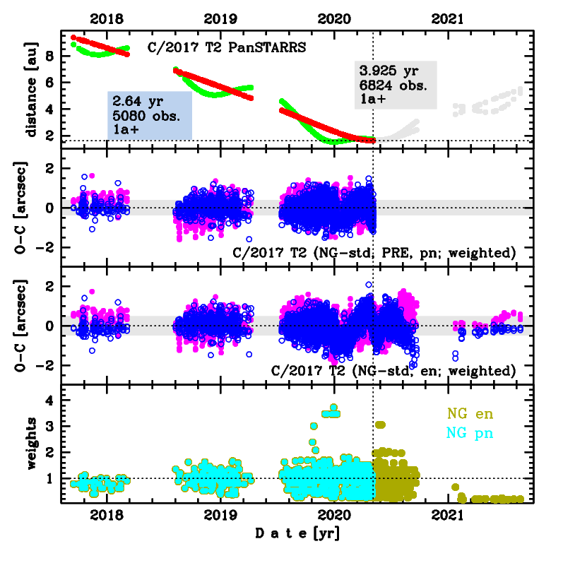 Comet C/2017 T2 was discovered on 2 October 2017 by Pan-STARRS 1 telescope (Haleakala) when it was 9.2 au from the Sun, that is about 7 months before its perihelion passage. Next, pre-discovery data were found going back to September 15. Comet was observed in four oppositions until 19 August 2021. C/2017 T1 had closest approach to the Earth on 28 December 2019 (1.52 au, about four months before the perihelion passage).