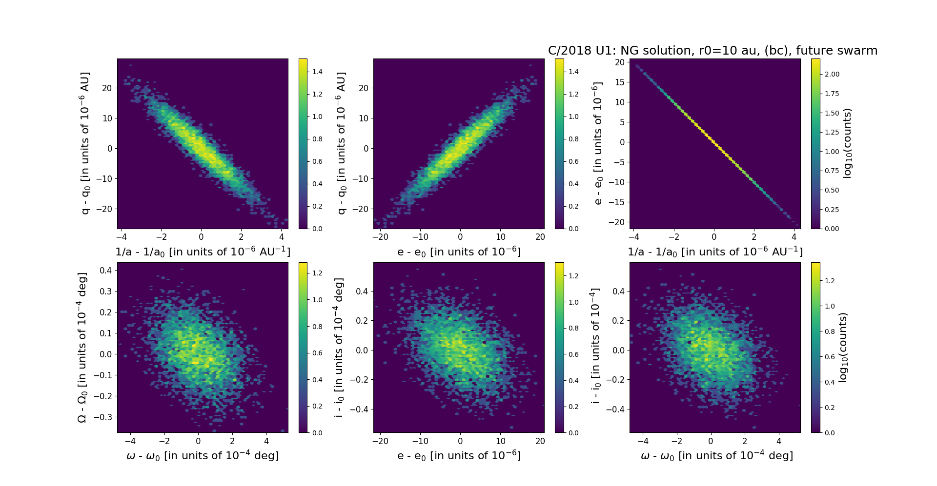 Six 2D-projections of the 6D space of future swarm including 5001 VCs. Each density map is given in logarithmic scale presented on the right in the individual panel.