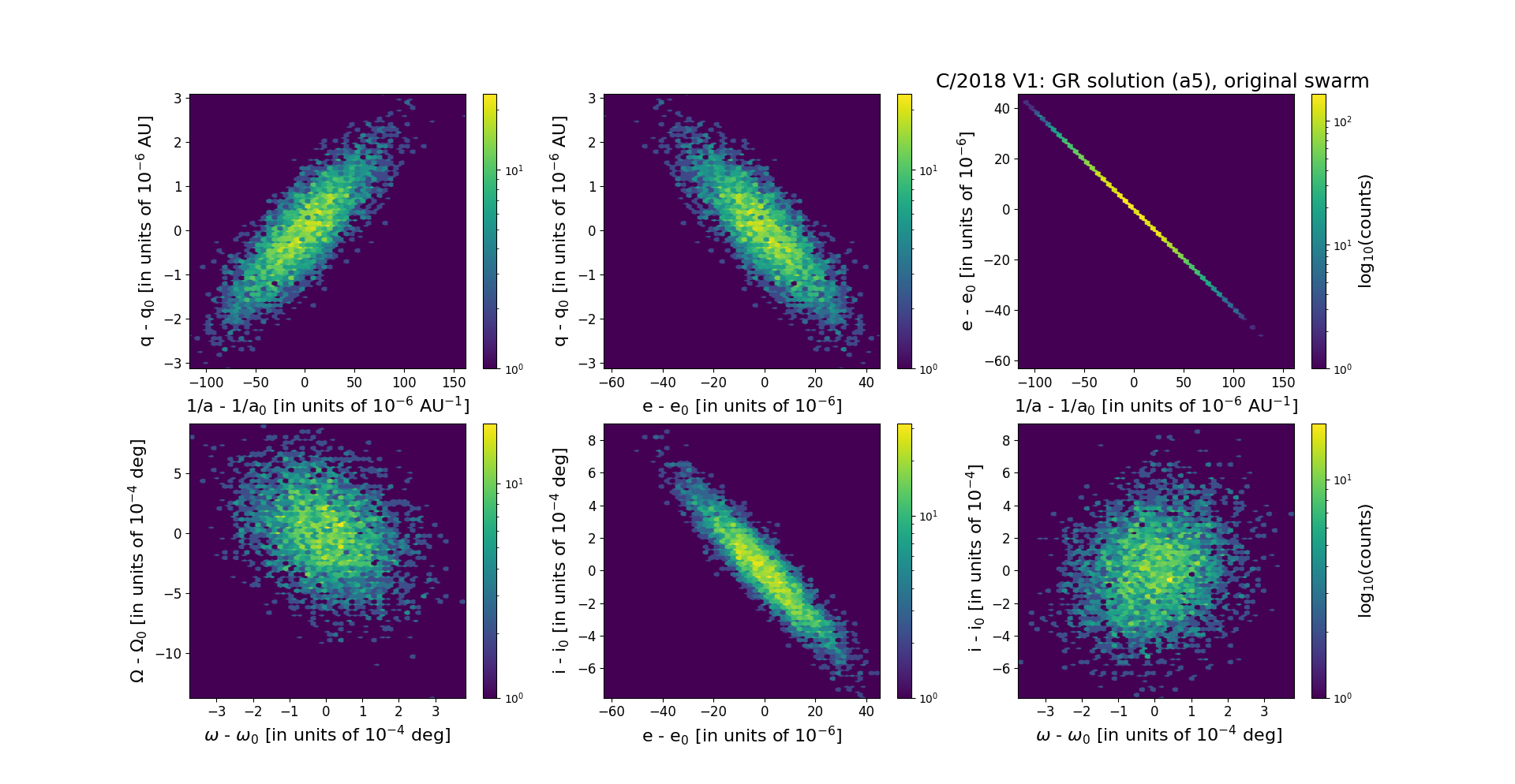Solutions (GR and NG) given here span over 0.101 yr in a range of heliocentric distances: 0.75 au – 0.39 au (perihelion) – 0.50 au;due to short data arc the orbital parameters are uncertain (orbit of 2b quality class).