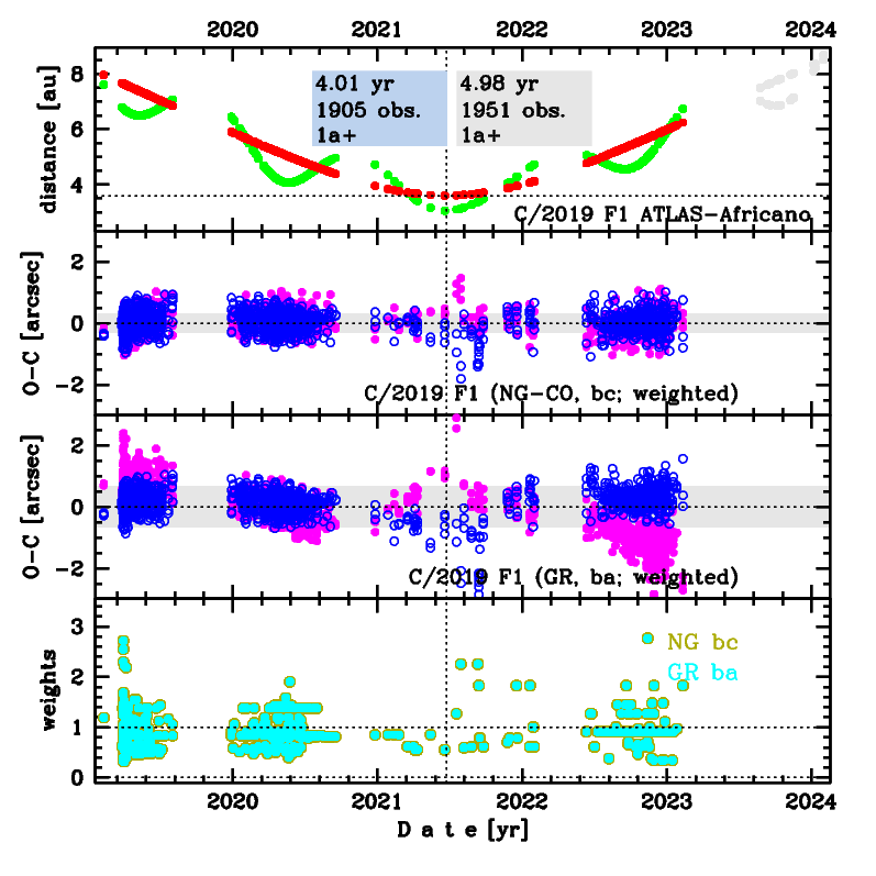 | detectability of NG effects in the comet's motion | comet with NG effects strongly manifested in positional data fitting | |
