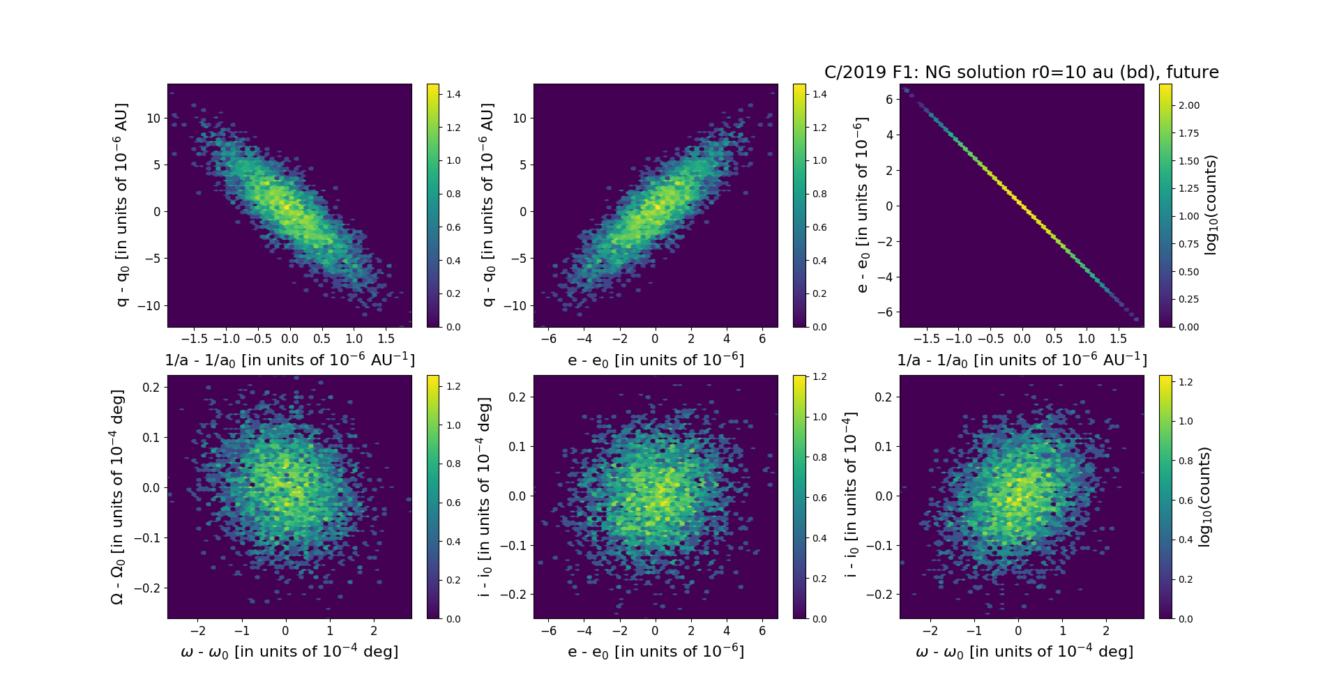 Six 2D-projections of the 6D space of future swarm including 5001 VCs. Each density map is given in logarithmic scale presented on the right in the individual panel.