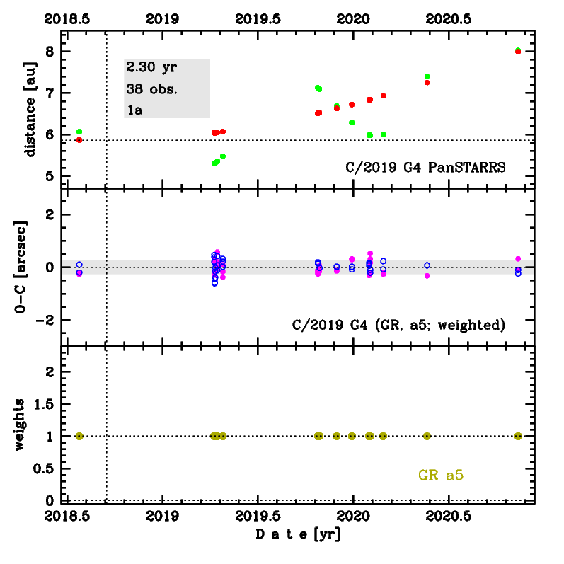 Comet C/2019 G4 was discovered on 9 April 2019, about 7 months after its perihelion passage. Later a two pre-discovery observations were found from 24 July 2018, these two measurements are the only data taken before perihelion passage.