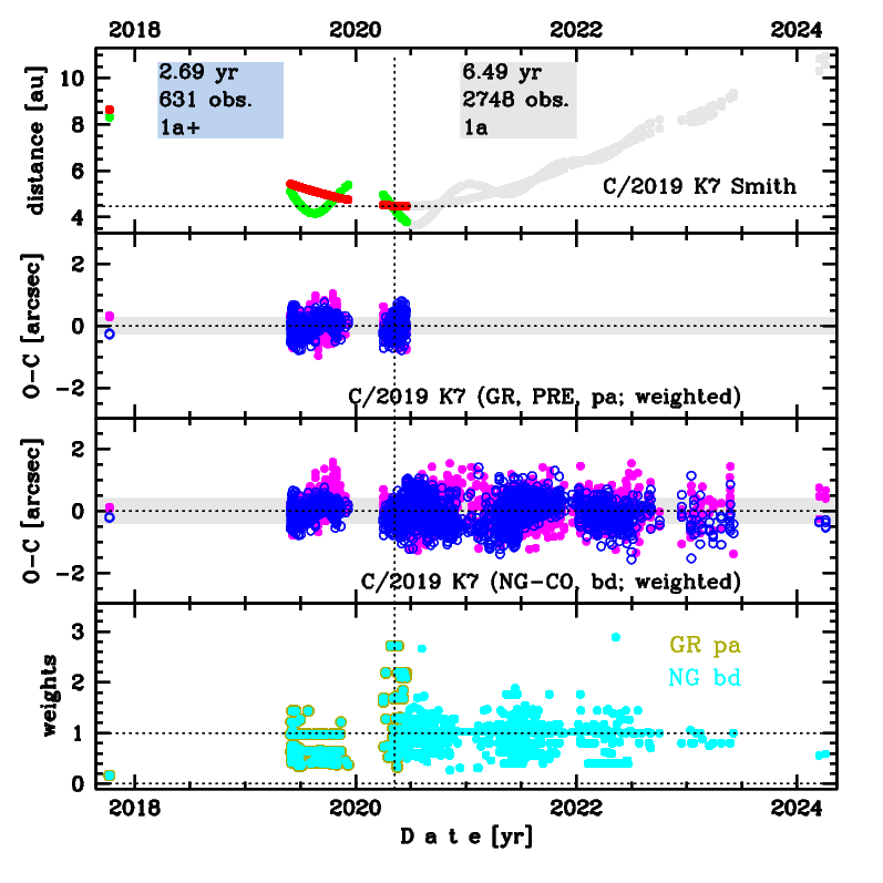 Comet C/2019 K7 was discovered on 30 May 2019, more than one year before its perihelion passage. Later a few pre-discovery observations were found from 8 and 9 October 2017. This comet was observed until 4 April 2024 (as in February 2025).