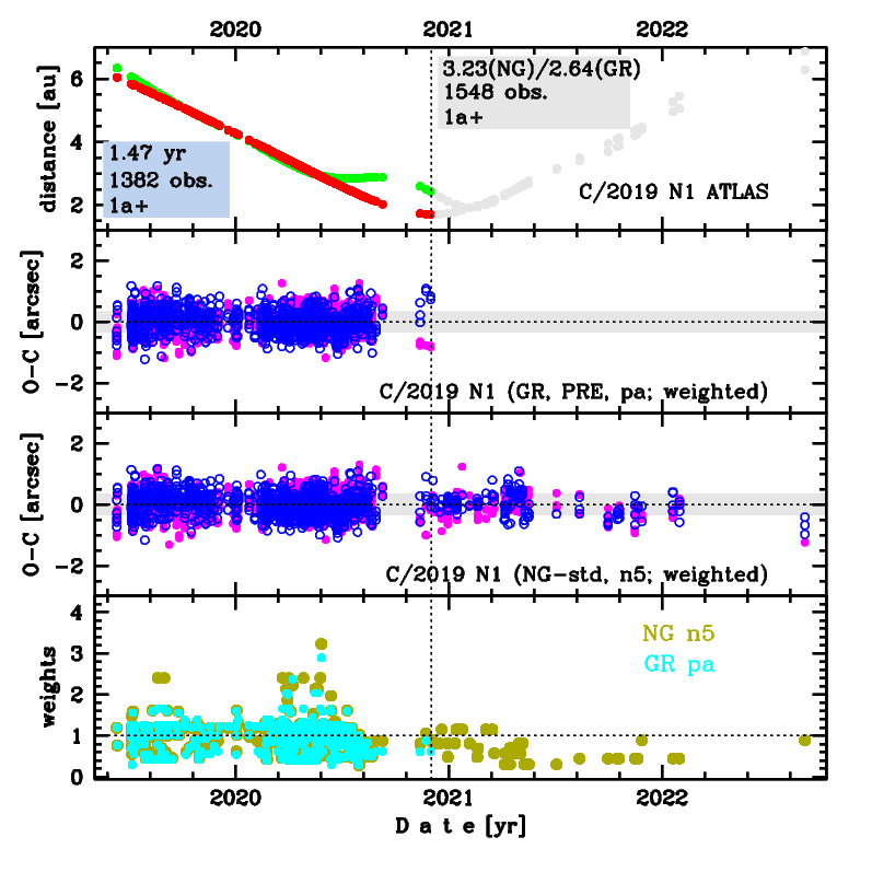 This is a comet with NG effects strongly manifested in positional data fitting. During GR orbit determination the series of measurements since 30 January 2022 wereejected due to large rersiduals and extremely low weights for all remaining post-perihelion observations were obtained (see [O-C] picture for 'a5' solution). Therefore, this GR orbit ('a5') is based on data spanning over 2.64 yr in a range of heliocentric distances: 6.05 au – 1.705 au (perihelion) – 5.05 au. During NG orbit determination weights in post-perihelion leg are also systematically small but notable larger than in the GR case and the full post-perihelion data arc were included. So, NG orbit ('n5') is based on data spanning over 3.23 yr in a range of heliocentric distances: 6.05 au – 1.705 au (perihelion) – 5.05 au. We suggest, this 'n5' orbit to be treated as 'preferred' for the dynamical study. Solution 'pa' represents GR orbit resulting from the entire pre-periheliuon data arc, and solutions 'pd' (GR) and'dd' (NG solution based on g(r)-formula for more volatile ices than water ice) are orbits obtained using the distant pre-perihelion data arc (heliocentric distance larger than 2.03 au).
