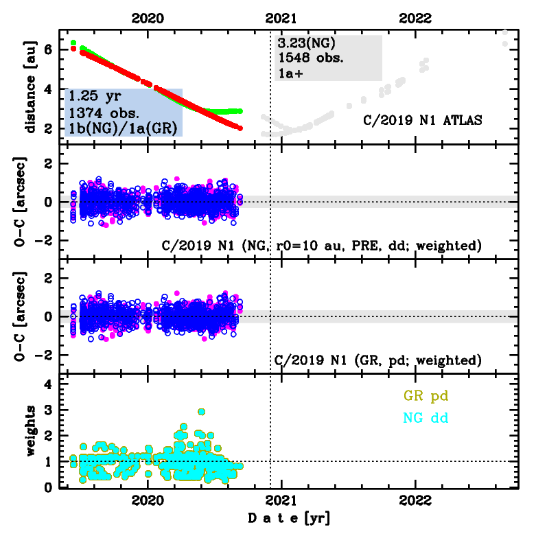 This is a comet with NG effects strongly manifested in positional data fitting. During GR orbit determination the series of measurements since 30 January 2022 wereejected due to large rersiduals and extremely low weights for all remaining post-perihelion observations were obtained (see [O-C] picture for 'a5' solution). Therefore, this GR orbit ('a5') is based on data spanning over 2.64 yr in a range of heliocentric distances: 6.05 au – 1.705 au (perihelion) – 5.05 au. During NG orbit determination weights in post-perihelion leg are also systematically small but notable larger than in the GR case and the full post-perihelion data arc were included. So, NG orbit ('n5') is based on data spanning over 3.23 yr in a range of heliocentric distances: 6.05 au – 1.705 au (perihelion) – 5.05 au. We suggest, this 'n5' orbit to be treated as 'preferred' for the dynamical study. Solution 'pa' represents GR orbit resulting from the entire pre-periheliuon data arc, and solutions 'pd' (GR) and'dd' (NG solution based on g(r)-formula for more volatile ices than water ice) are orbits obtained using the distant pre-perihelion data arc (heliocentric distance larger than 2.03 au).