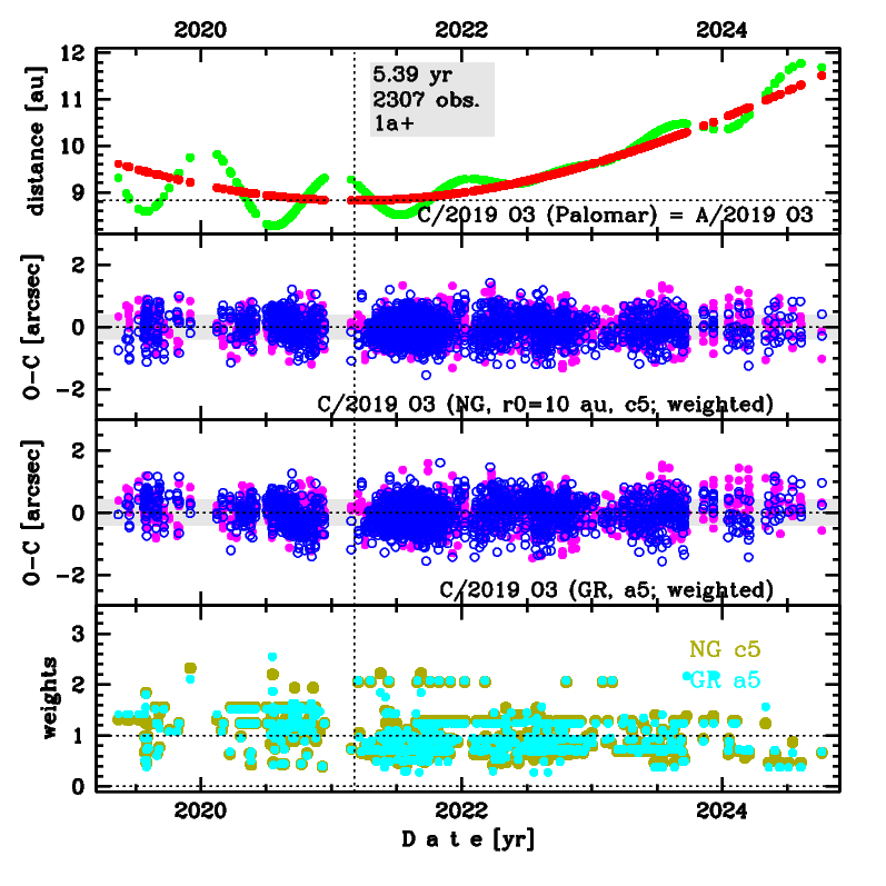 Currently, preferred NG solution given here are based on data span over 5.39 yr in a range of heliocentric distances: 9.61 au – 8.82 au (perihelion) – 11.51 au. Orbits based on pre-perihelion and post-perihelion data independently were also obtained.