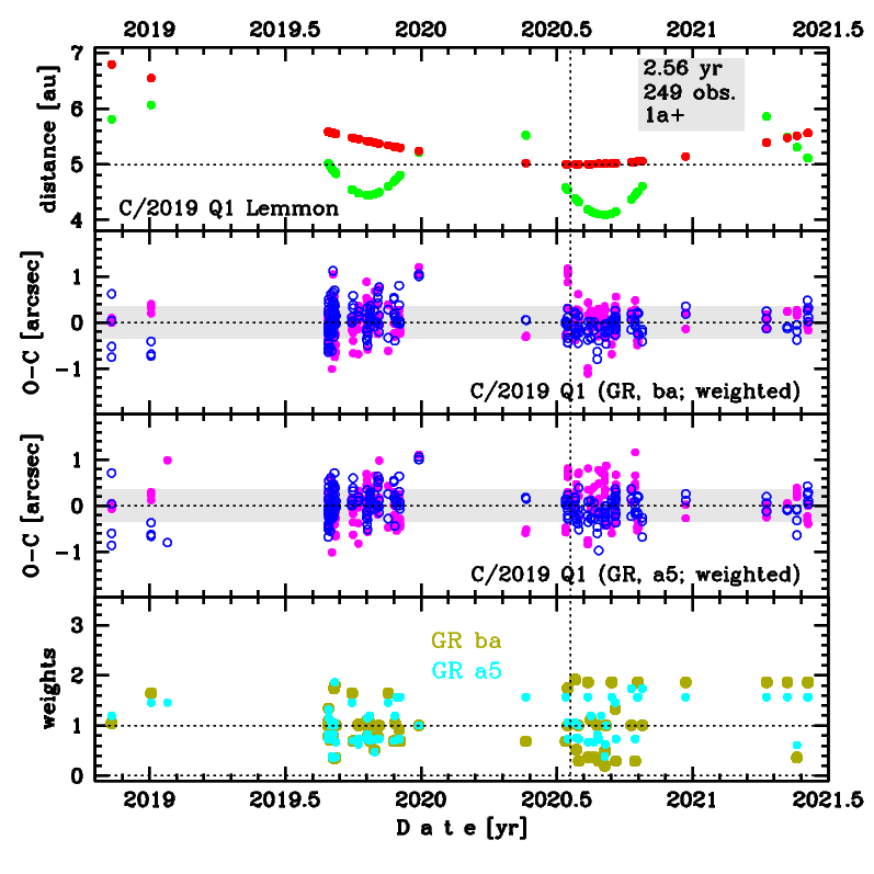 Solutions (GR and NG) given here are based on data span over 2.56 yr in a range of heliocentric distances: 6.80 au – 5.00 au (perihelion) – 5.56 au. Orbits based on pre-perihelion and post-perihelion data independently were also obtained.