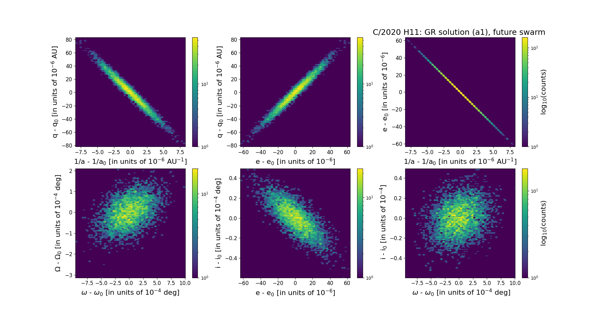 Six 2D-projections of the 6D space of future swarm including 5001 VCs. Each density map is given in logarithmic scale presented on the right in the individual panel.