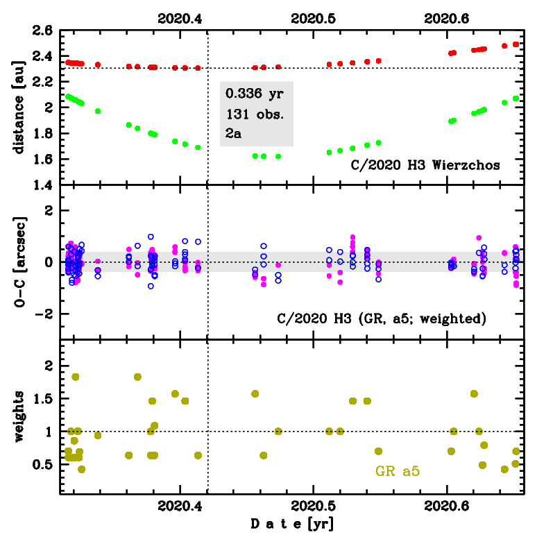 GR solution given here is based on data spanning over 0.336 yr in a range of heliocentric distances: 2.35 au – 2.30 au (perihelion) – 2.49 au. NG orbit is not possible to obtain.