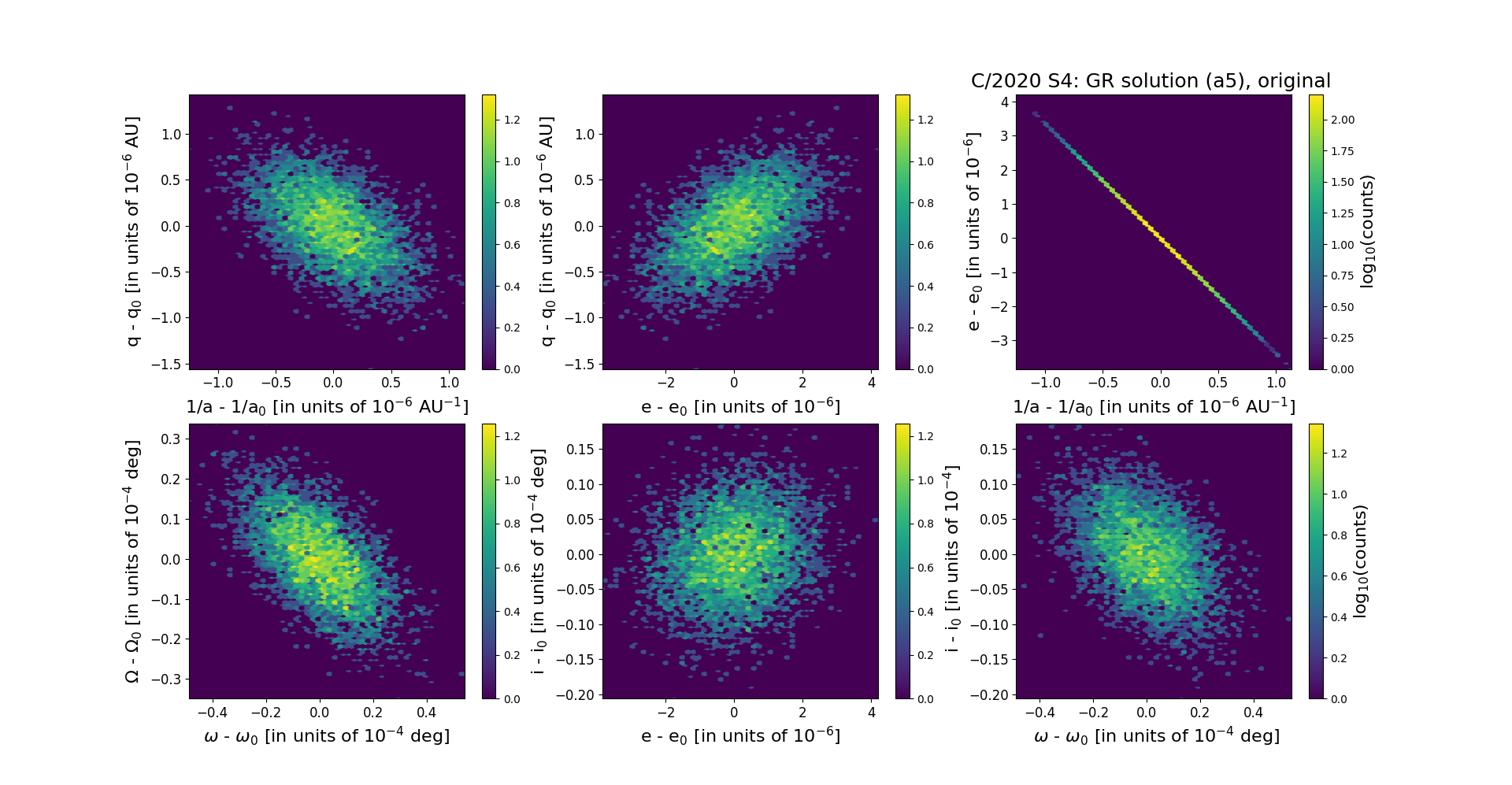 Six 2D-projections of the 6D space of original swarm including 5001 VCs. Each density map is given in logarithmic scale presented on the right in the individual panel.
