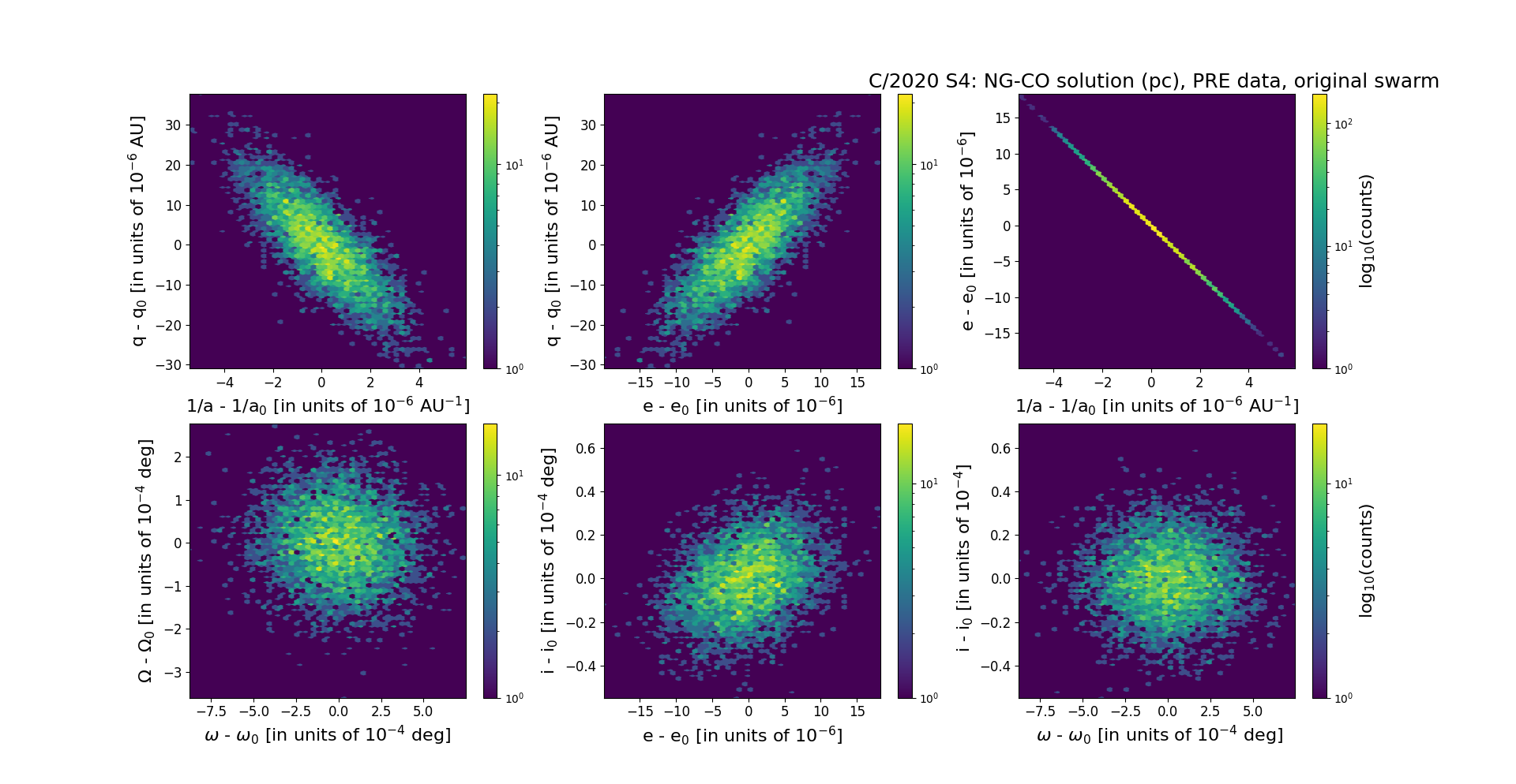 Six 2D-projections of the 6D space of original swarm including 5001 VCs. Each density map is given in logarithmic scale presented on the right in the individual panel.