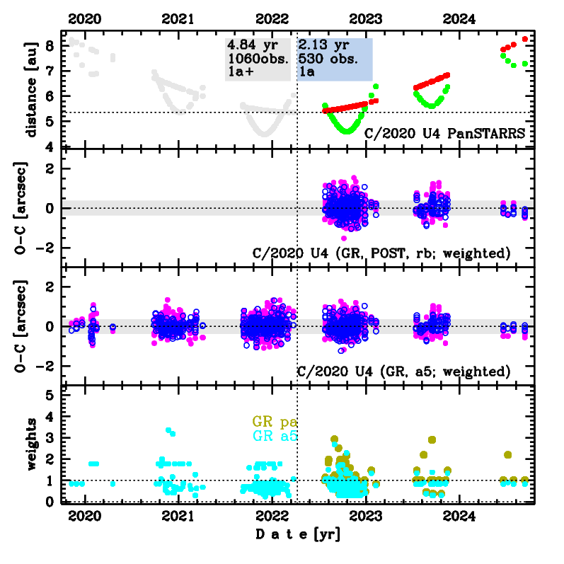 Comet C/2020 U4 was discovered on 22 October 2020, about 1.5 yr before its perihelion passage; later a series of prediscovery images was found going back to 9 November 2019. This comet was observed until 11 September 2024 (as in February 2025).