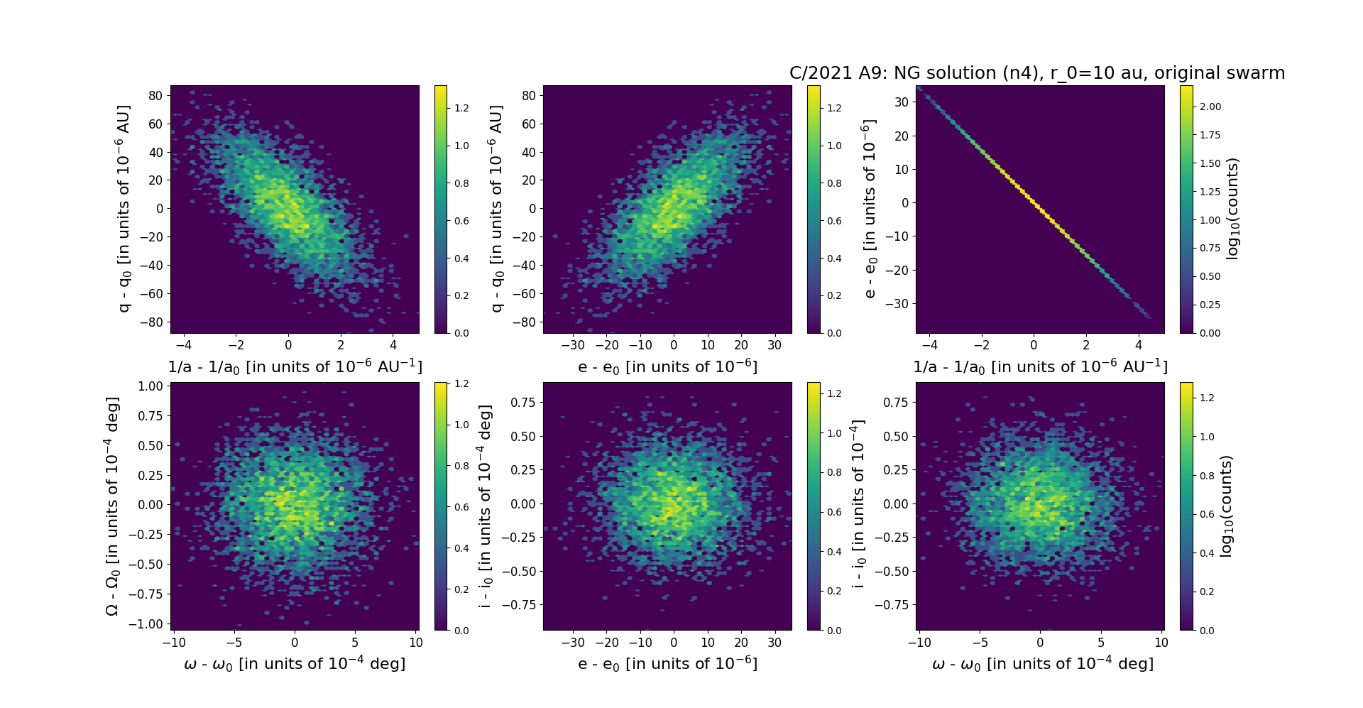 Six 2D-projections of the 6D space of original swarm including 5001 VCs. Each density map is given in logarithmic scale presented on the right in the individual panel.