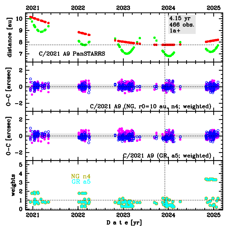 Comet C/2021 A9 was discovered on 12 January 2021 with the Pan-STARRS 1 telescope (Haleakala), that is almost two years before its perihelion passage. a few pre-discovery measurements were next found extending the data arc one month back. Comet is still observed as in April 2025.