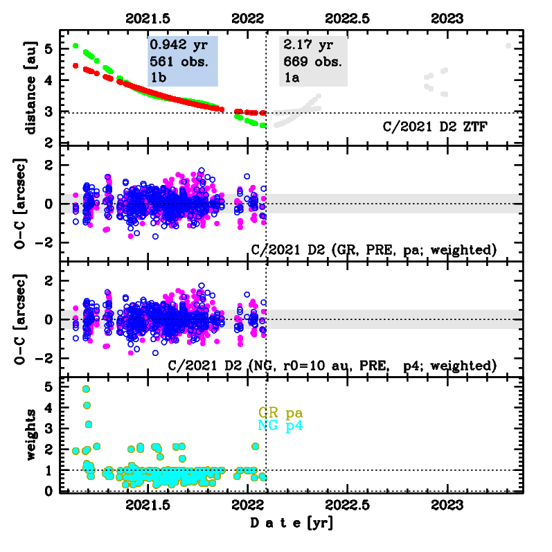 Comet C/2021 D2 was discovered on 19 February 2021 by Palomar Mountain--ZTF, that is almost a year before its perihelion passage.