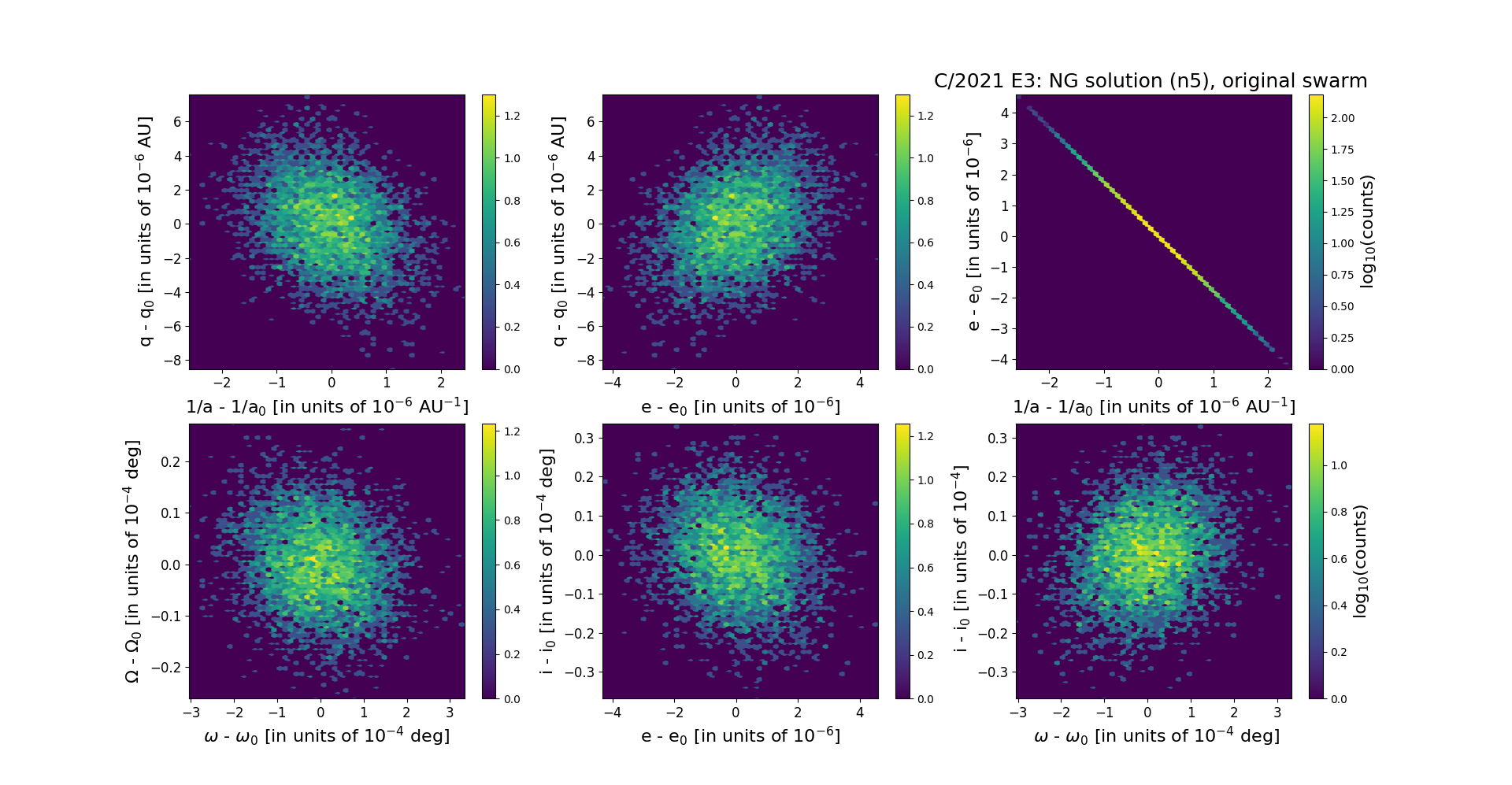 This comet shows visible trends in the O-C distribution for a GR orbit; see [O-C] diagram for solution 'a5'. The preferred NG solution given here ('nt') is based on data span over 2.85 yr in a range of heliocentric distances: 5.34 au – 1.777 au (perihelion) – 6.35 au.