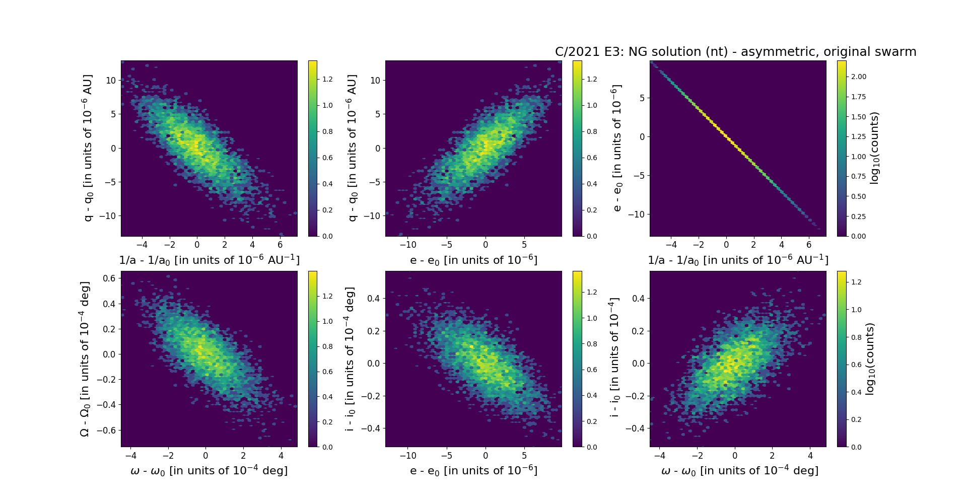 This comet shows visible trends in the O-C distribution for a GR orbit; see [O-C] diagram for solution 'a5'. The preferred NG solution given here ('nt') is based on data span over 2.85 yr in a range of heliocentric distances: 5.34 au – 1.777 au (perihelion) – 6.35 au.