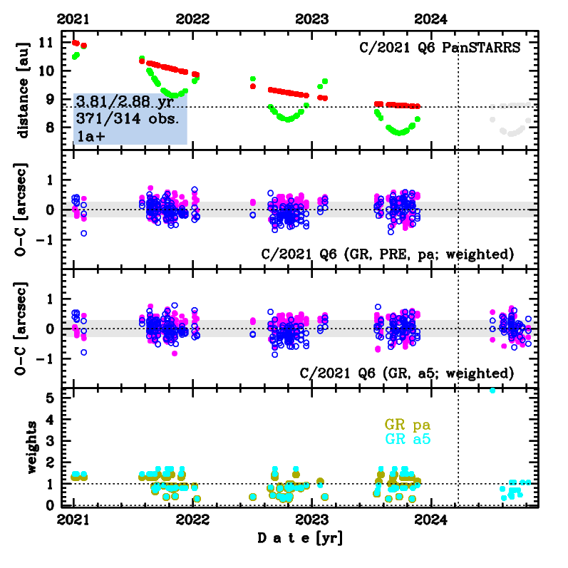 Comet C/2021 Q6 was discovered on 22 August 2021 with the Pan-STARRS 1 telescope (Haleakala), that is two years and seven months before its perihelion passage.
