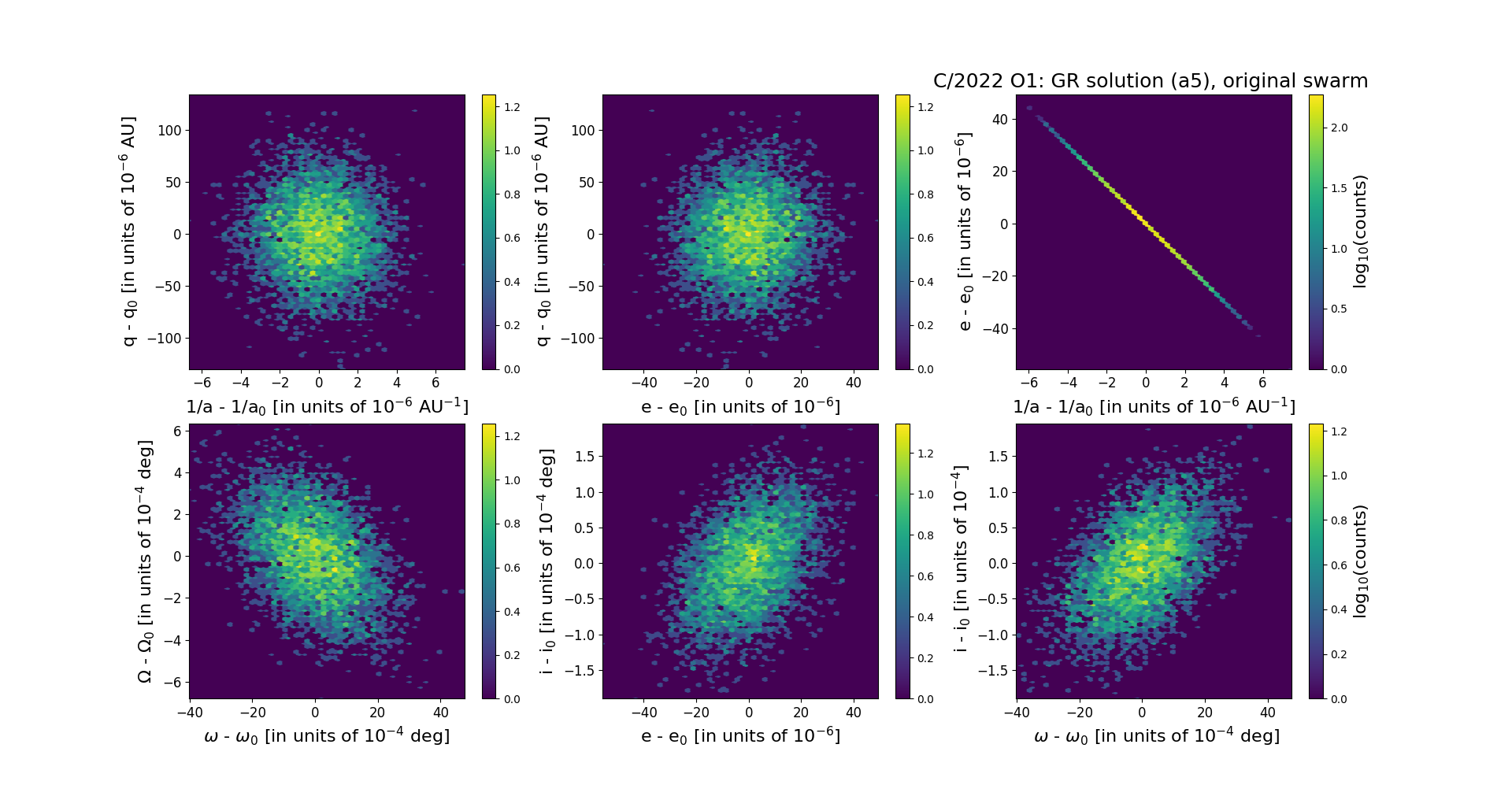 Six 2D-projections of the 6D space of original swarm including 5001 VCs. Each density map is given in logarithmic scale presented on the right in the individual panel.