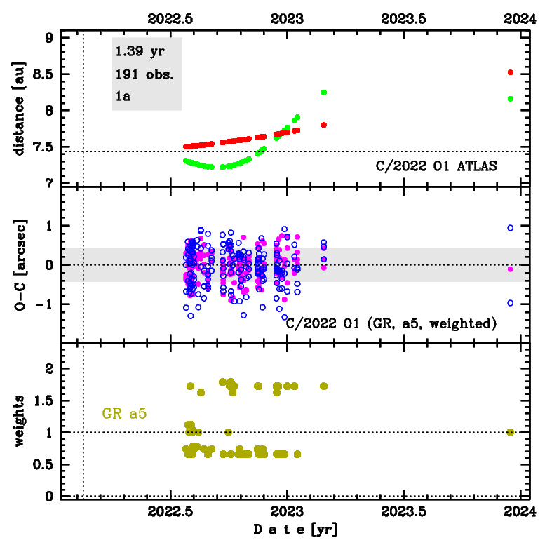 Thus, the GR solution given here is based on post-perihelion data span over 1.39 yr in a range of heliocentric distances from 7.50 au to 8.52 au.